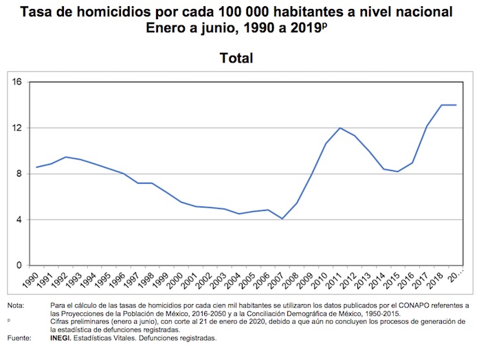 Los primeros seis meses de 2019 se registraron más de 17 mil homicidios en todo el país, a razón de 14 asesinatos por cada 100 mil habitantes. De acuerdo con el Secretariado Ejecutivo Nacional, en junio de 2019 se dio la mayor cantidad de homicidios dolosos en el país, con 2 mil 993 casos; en contraste, en abril se registró la cifra más baja, con 2 mil 371.