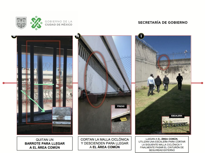 “Se cortó un barrote de seguridad donde se infiere que los evadidos descendieron 1.5 metros a un área común, y con cizallas cortaron la malla para salir a la parte superior del muro perimetral del reclusorio, para de ahí bajar al área de vehículos”, precisó la Secretaria de Gobierno.