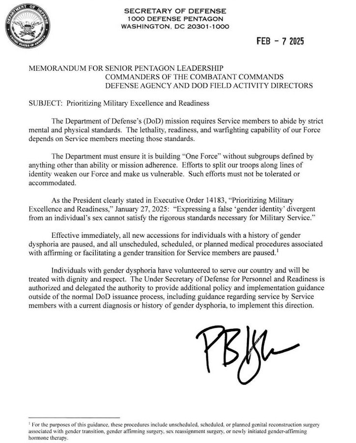 El propio Departamento de Defensa estadounidense ha indicado en un memorando que “todos los miembros del servicio militar que hayan sido diagnosticados o presenten síntomas de disforia de género serán retirados del servicio”, según el documento al que ha tenido acceso la cadena de televisión CNN.