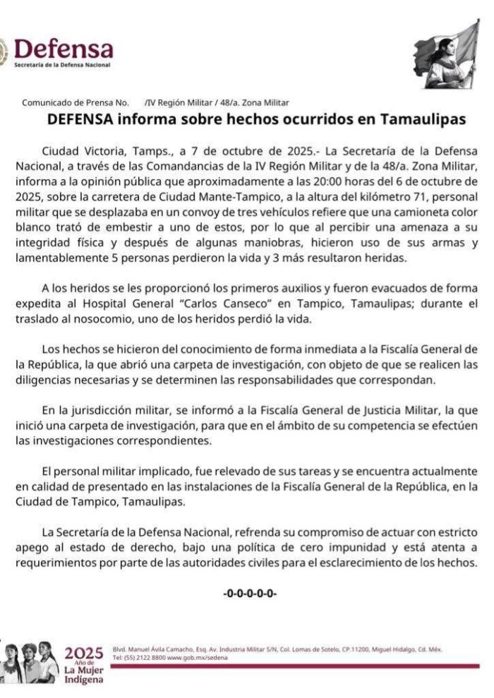 Más tarde, la Sedena precisó que uno de los heridos falleció mientras recibía atención médica en el Hospital General Carlos Canseco, en Tampico, elevando el número de víctimas mortales a seis.