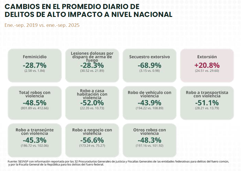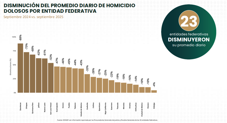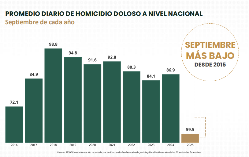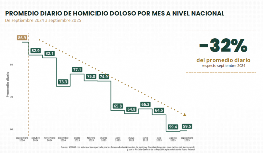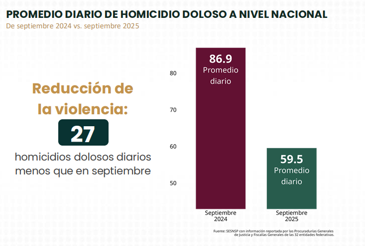 En ese periodo, el número de homicidios en el país descendió de 86.9 casos diarios en septiembre de 2024 a 59.5 en el mismo mes de 2025, una diferencia de 27 homicidios menos por día.
