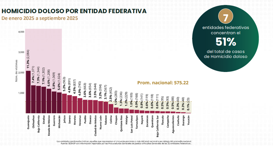 La funcionaria precisó que siete entidades concentran el 51 por ciento de los homicidios registrados en el país: Guanajuato, Chihuahua, Baja California, Sinaloa, Estado de México, Guerrero y Michoacán.