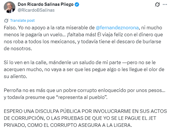 “ESPERO UNA DISCULPA PÚBLICA POR INVOLUCRARME EN SUS ACTOS DE CORRUPCIÓN, O LAS PRUEBAS DE QUE YO LE PAGUÉ EL JET PRIVADO, COMO EL CORRUPTO ASEGURA A LA LIGERA”, añadió.
