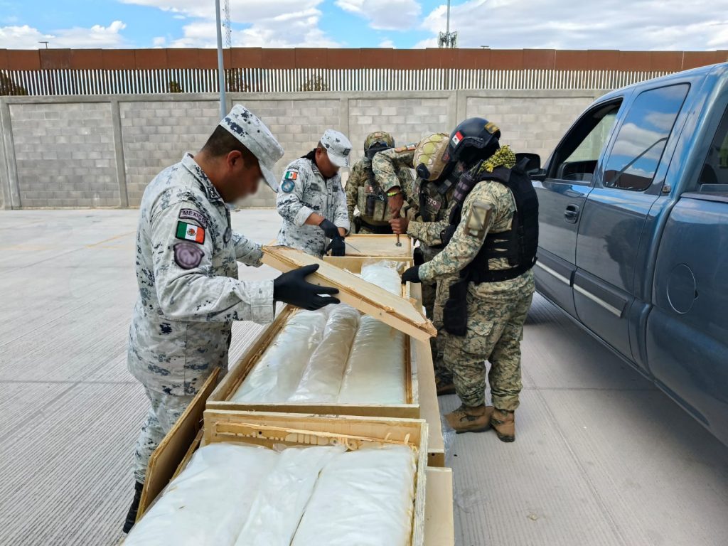 Hermosillo, Sonora.- Vehículos de gama alta ocultos en un caja de tráiler, además de drogas escondidas en muebles de oficina, así como de material bélico y un automóvil con reporte de robo, fueron asegurados en la frontera de Sonora por agentes de la Guardia Nacional.