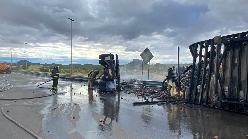 Hermosillo, Sonora.- Un tráiler que transportaba manzanas se volcó y posteriormente se incendió, durante la tarde del domingo 12 de octubre, sobre el kilómetro 237 de la carretera Hermosillo–Guaymas, bajando del libramiento en dirección de norte a sur, lo que provocó el cierre temporal del puente y un considerable tráfico en la zona.