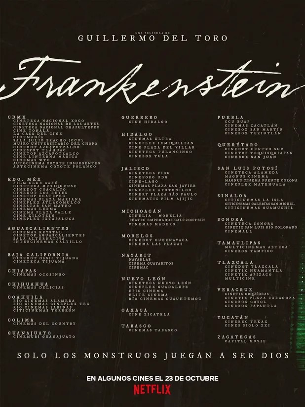 El director mexicano Guillermo del Toro alista el estreno de uno de sus proyectos más esperados: su adaptación cinematográfica de “Frankenstein“, basada en la novela clásica de Mary Shelley. La película tendrá un preestreno en cines seleccionados el próximo 23 de octubre, antes de su lanzamiento oficial en Netflix el 7 de noviembre.