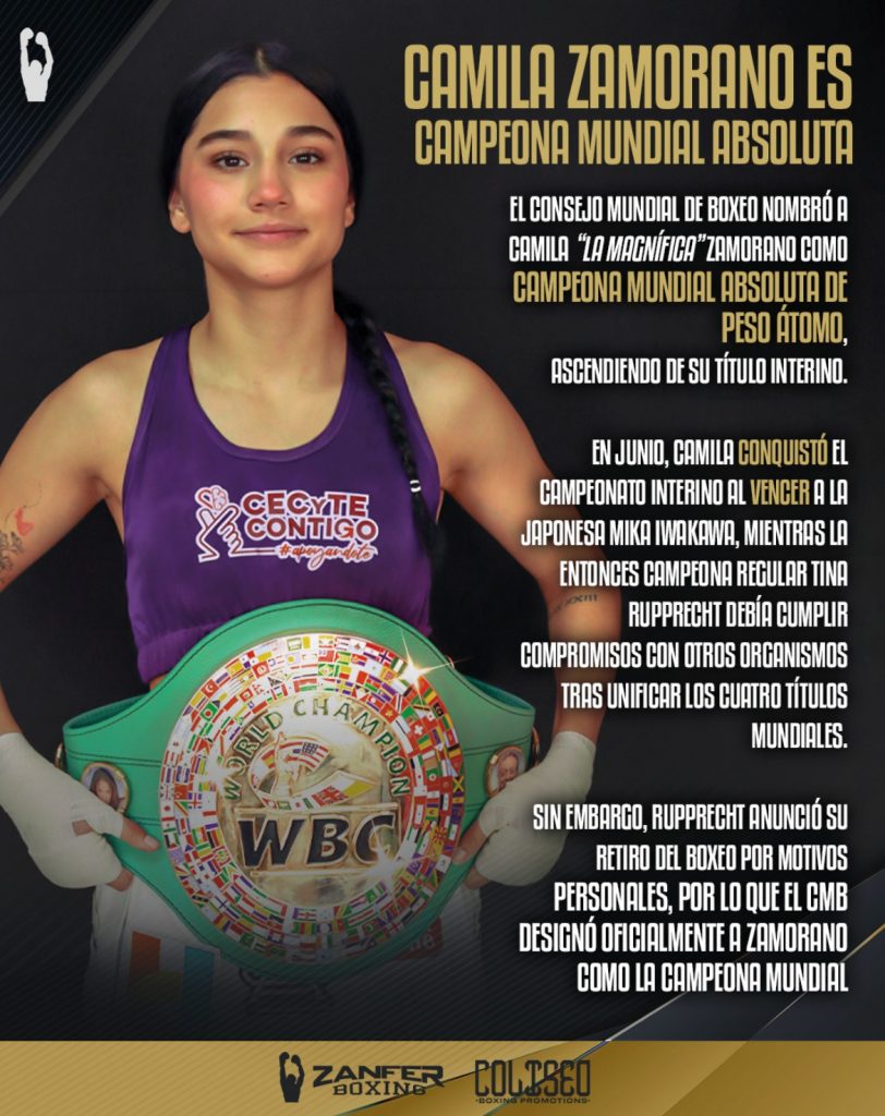 Zamorano, quien ostentaba el cetro interino, tras vencer a la japonesa Mika Iwakawa (13-9-1, 4 KO’s), subió a campeona regular, después de que la alemana (y monarca unificada) Tina Rupprecht (15-1-1, 3 KO’s), anunciará su retiro por motivos personales.