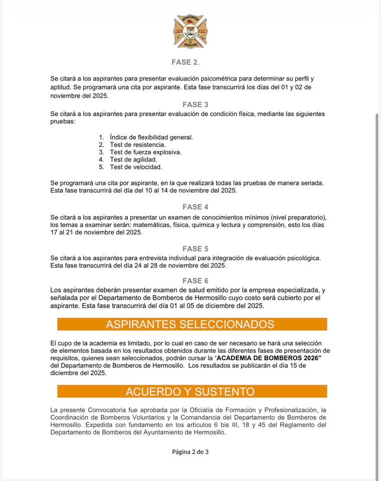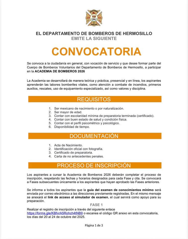 La convocatoria fue aprobada por la Oficialía de Formación y Profesionalización, en coordinación con la Comandancia del Departamento de Bomberos de Hermosillo.