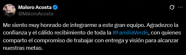 “Agradezco la confianza y el cálido recibimiento de toda la #FamiliaVerde, con quienes comparto el compromiso de trabajar con entrega y visión para alcanzar nuestras metas”, escribió.
