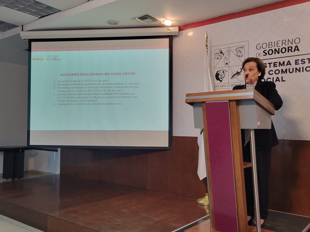 Hermosillo, Sonora.- La Secretaría Anticorrupción y Buen Gobierno, encabezada por María Dolores del Río, informó que se mantiene en curso una investigación sobre el presunto desvío de 67 millones de pesos detectado en el Consejo Estatal de Concertación para la Obra Pública (CECOP), tras una denuncia interpuesta el pasado 1 de abril.