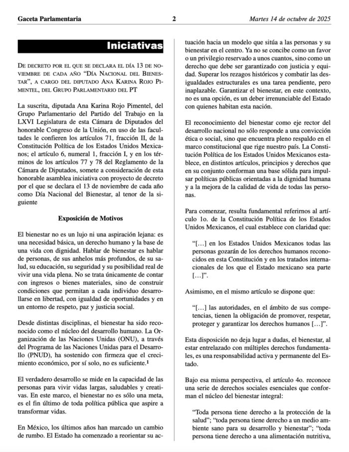 La diputada Ana Karina Rojo Pimentel, del Grupo Parlamentario del Partido del Trabajo (PT), presentó una iniciativa para declarar “Día Nacional del Bienestar” el 13 de noviembre de cada año, coincidiendo con el cumpleaños del expresidente Andrés Manuel López Obrador.