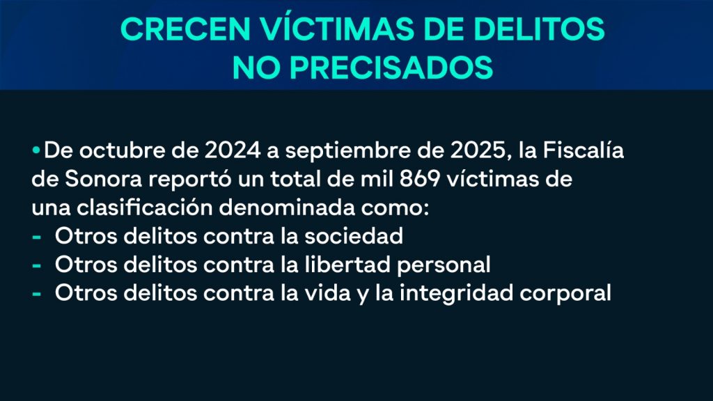 Los mismos registros del SESNSP arrojan que en el periodo de octubre de 2024 a septiembre de 2025 la Fiscalía de Sonora reportó un total de mil 869 víctimas en una clasificación denominada como “otros delitos contra la sociedad”, “otros delitos contra la libertad personal”, y “otros delitos contra la vida y la integridad corporal”.