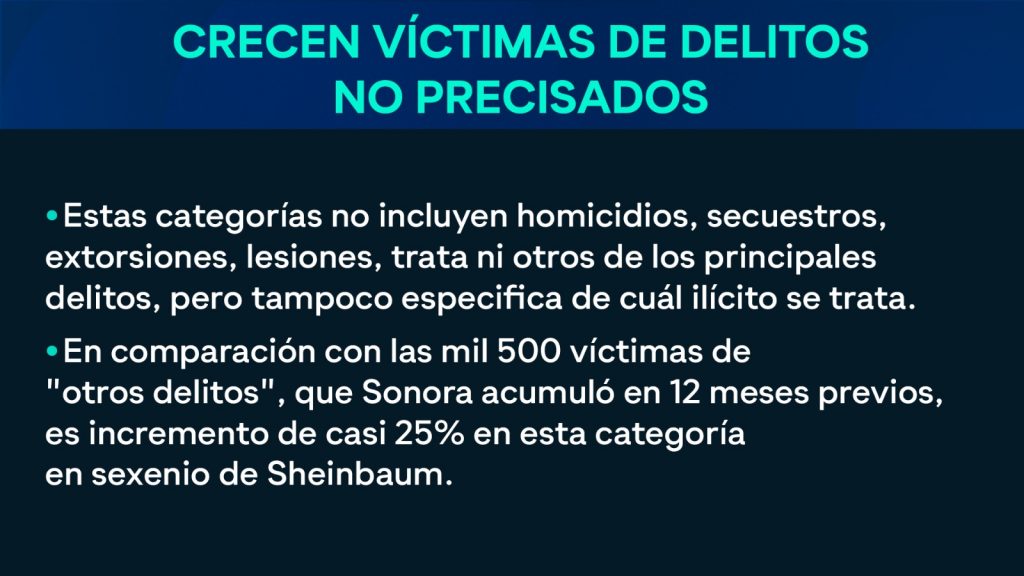 En comparación con las 1 mil 500 víctimas de “otros delitos” que Sonora acumula para el periodo de doce meses previos, es un incremento de casi el 25 por ciento en esta categoría en el sexenio de Sheinbaum.