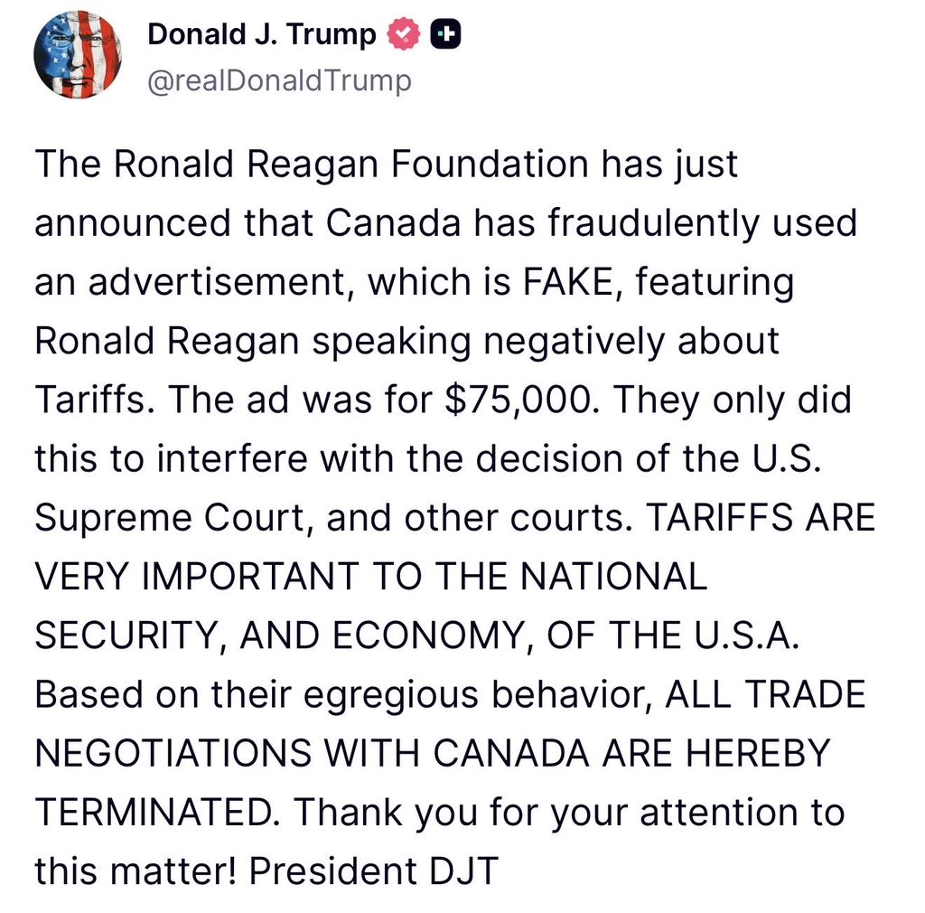 “Debido a su comportamiento atroz, se dan por terminadas todas las negociaciones comerciales con Canadá”, escribió Trump en su mensaje.