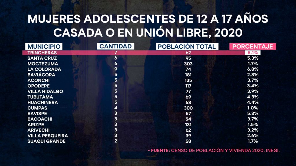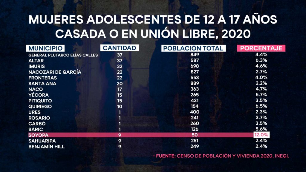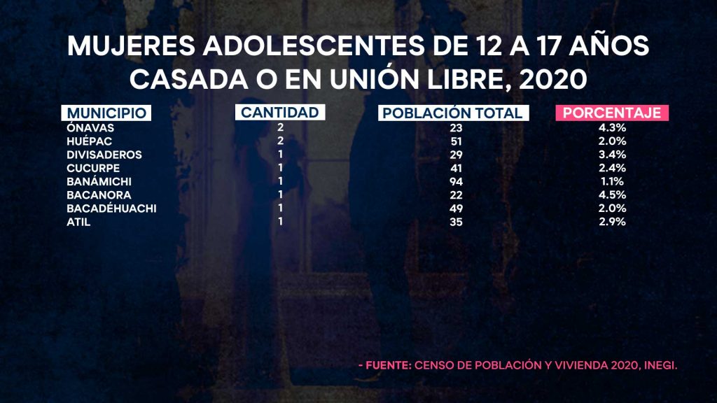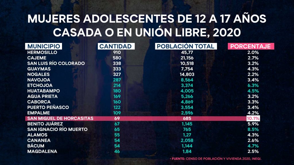 Según el Censo de Población y Vivienda del Instituto Nacional de Estadística y Geografía (Inegi), hasta 2020 había en Sonora 5 mil 935 matrimonios registrados en donde una de las dos personas tenía entre 12 y 17 años. Mil 452 eran hombres y 4 mil 483 eran mujeres.
