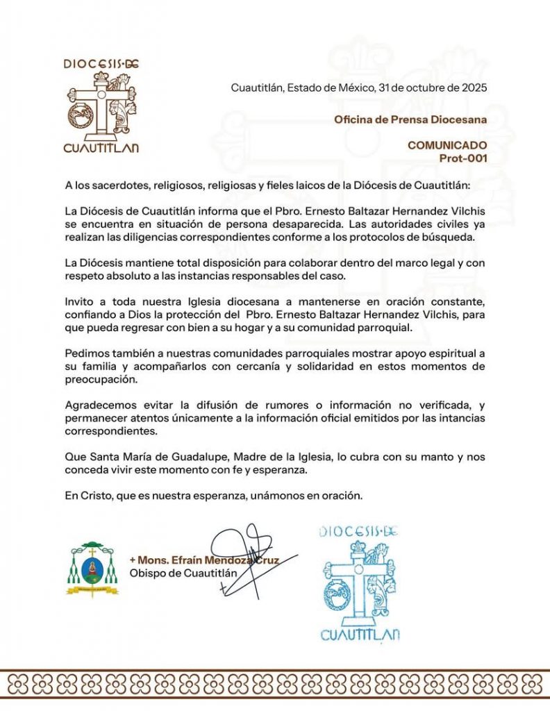 La Diócesis de Cuautitlán informó este viernes sobre la desaparición del sacerdote Ernesto Baltazar Hernández Vilchis, vista por última vez el pasado 27 de octubre en el municipio de Tultepec, Estado de México.