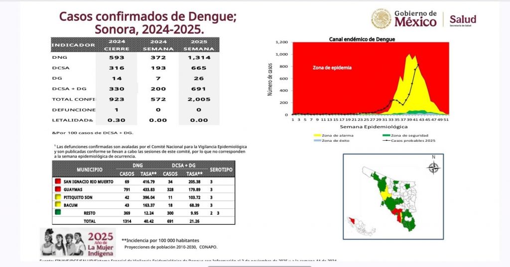 Sonora suma actualmente 2 mil 5 casos de dengue, una cifra que representa cinco veces el total de casos registrados en 2024 a la misma fecha; esto posiciona al Estado en quinto lugar de incidencia a nivel nacional.