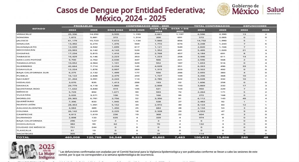 Para 2024, el total de contagios confirmados fue de 923; a noviembre de 2025, Sonora registra 2 mil 5, superando ya el total del año anterior; sin embargo, actualmente no se registra de manera oficial ninguna defunción; en 2024 se confirmó una muerte por dengue.
