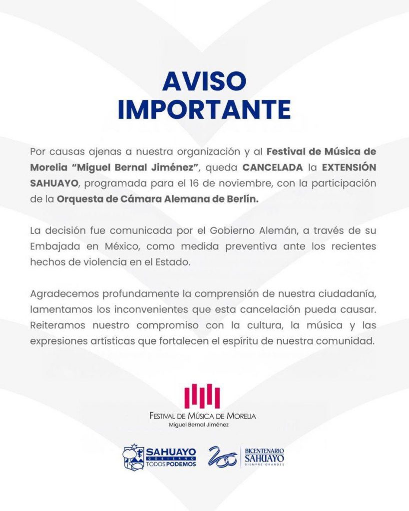 La extensión del Festival de Música de Morelia “Miguel Bernal Jiménez” prevista para realizarse en Sahuayo el 16 de noviembre fue cancelada debido a preocupaciones de seguridad derivadas de los recientes hechos de violencia en Michoacán.