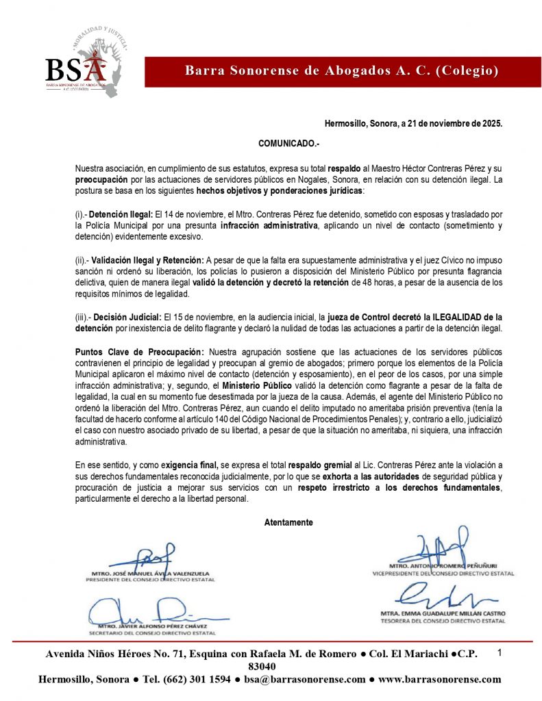 Hermosillo, Sonora.– La Barra Sonorense de Abogados A. C. manifestó su “total respaldo gremial” al abogado Héctor Contreras Pérez y expresó preocupación por la actuación de elementos de seguridad pública en Nogales, luego de que —según documentó la agrupación— el litigante fue detenido de manera ilegal el pasado 14 de noviembre.