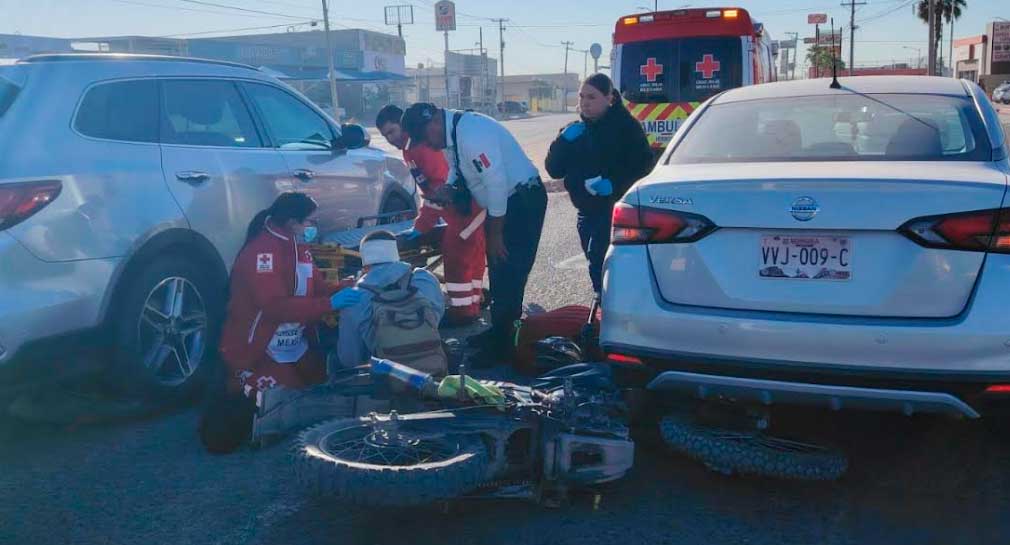 Hermosillo, Sonora.- El conductor de una motocicleta resultó lesionado luego de ser embestido por dos automóviles, presuntamente al no respetar el alto fijo de una intersección de calles.