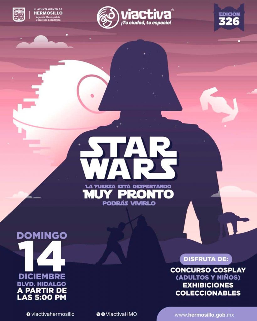 Hermosillo, Sonora.- “Que la fuerza te acompañe” será la frase que marcará la edición temática de Víactiva dedicada a Star Wars este domingo 14 de diciembre en el Centro Histórico, anunció Fernanda Cisneros Rodríguez.