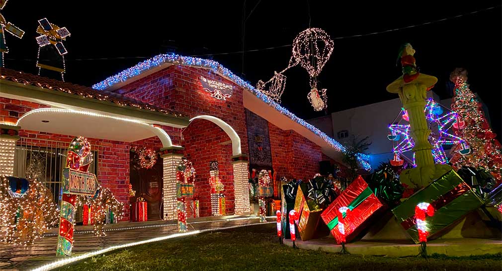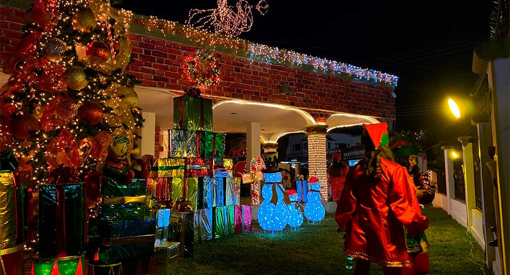 La vivienda llama la atención por su colorida ambientación que simula un gran taller de juguetes, con muros de ladrillo rojo, ángeles decorativos con trompetas en la azotea, una rueda de la fortuna adornada con figuras infantiles y muñecos de nieve distribuidos en el entorno.