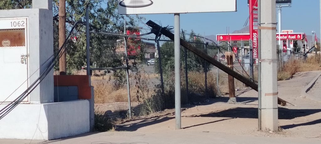 Hermosillo, Sonora.- Cables y postes de madera se vinieron abajo luego de que la caja de un tráiler se atorara en los mismos luego de que el conductor de la pesada unidad intentó ingresar a un negocio ubicado al norte de la ciudad.