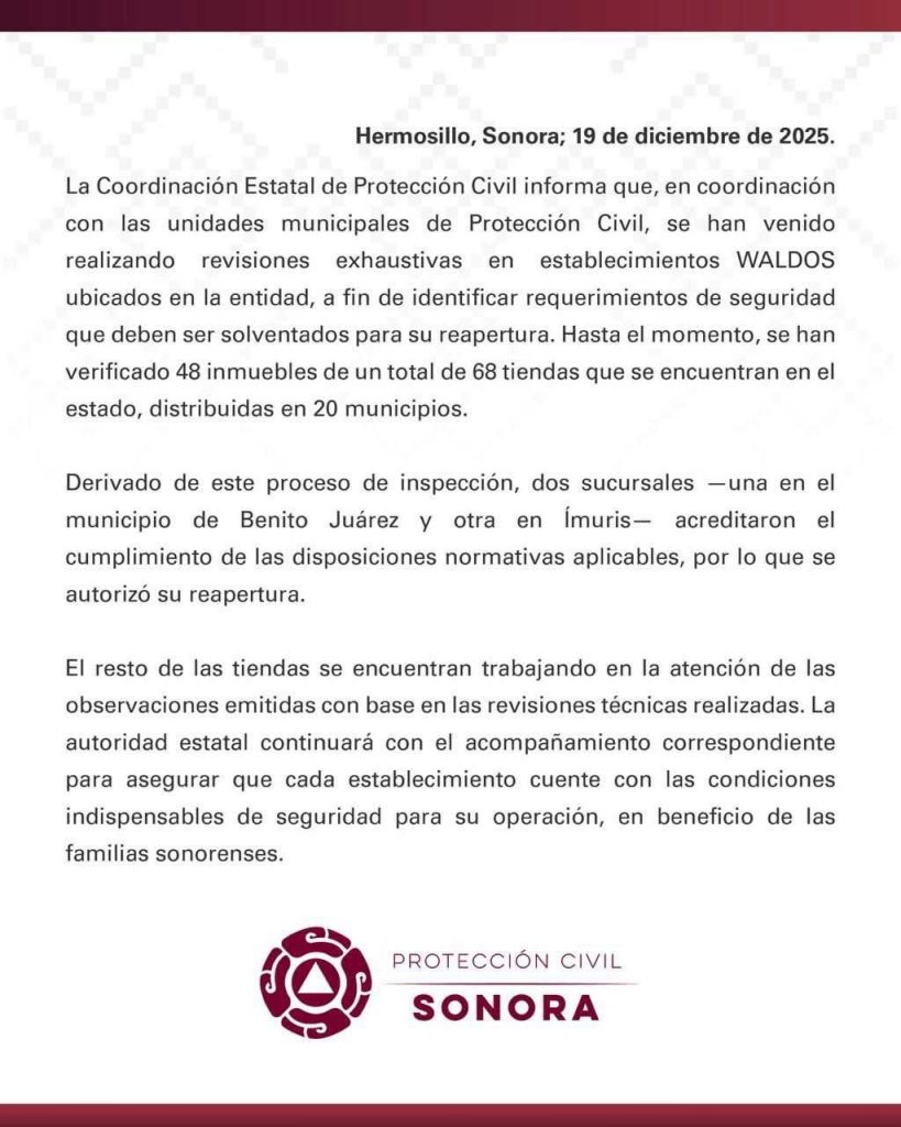 Hermosillo, Sonora.– La Coordinación Estatal de Protección Civil informó que, en coordinación con las unidades municipales, se han realizado revisiones exhaustivas en establecimientos de la cadena Waldo’s ubicados en Sonora, con el objetivo de identificar los requerimientos de seguridad necesarios para su reapertura.