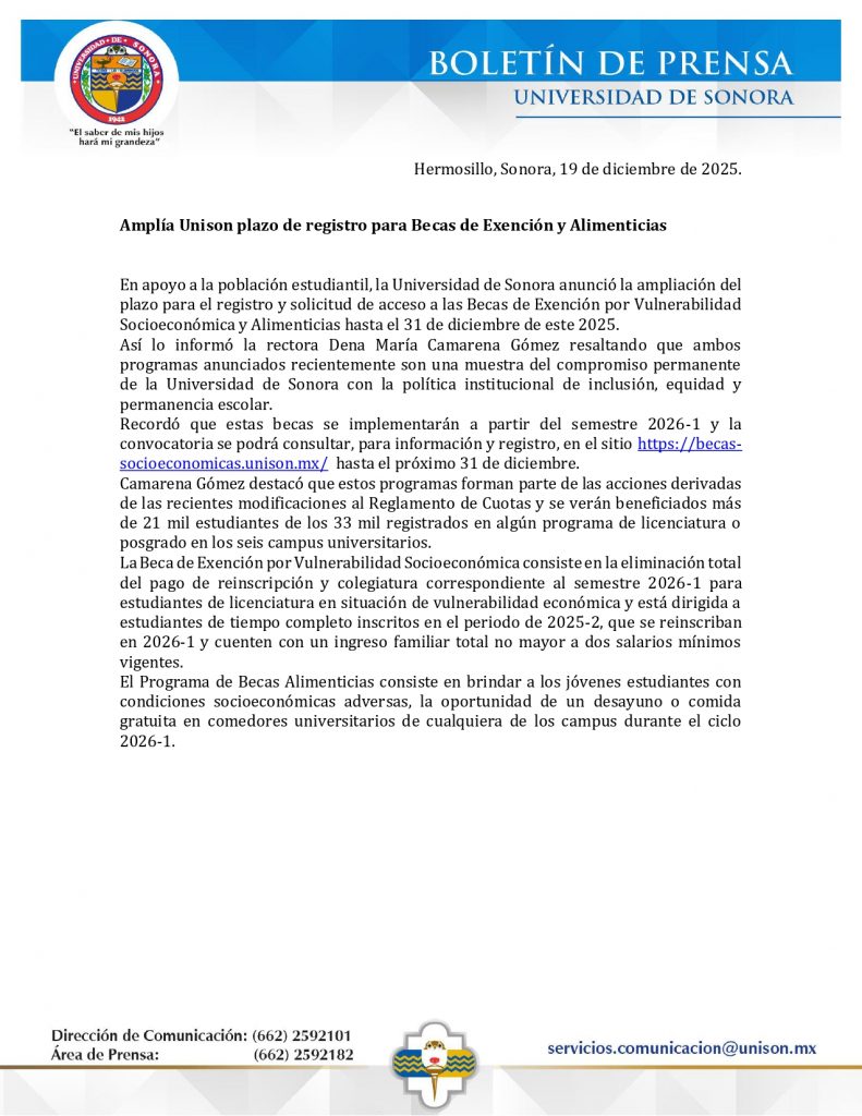 La Universidad de Sonora (Unison) otorgó una prórroga para que más estudiantes puedan acceder a los apoyos económicos y alimentarios anunciados recientemente, al extender hasta el 31 de diciembre de 2025 el periodo de registro para las Becas de Exención por Vulnerabilidad Socioeconómica y las Becas Alimenticias.
