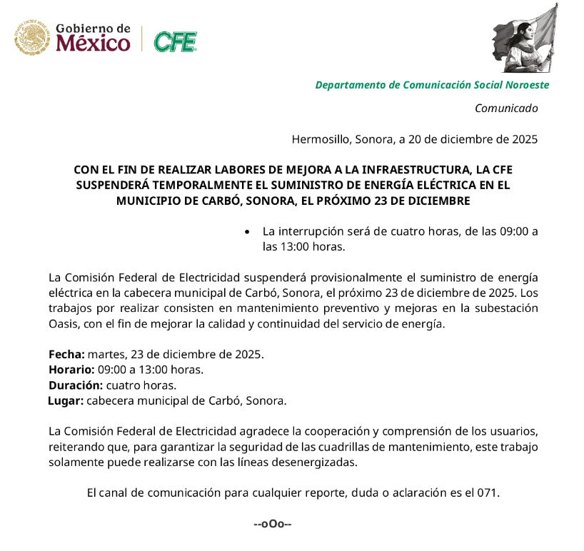 Hermosillo, Sonora.- La Comisión Federal de Electricidad (CFE) informó que el próximo martes 23 de diciembre se suspenderá de manera temporal el suministro de energía eléctrica en el municipio de Carbó, como parte de trabajos de mejora en la infraestructura eléctrica.