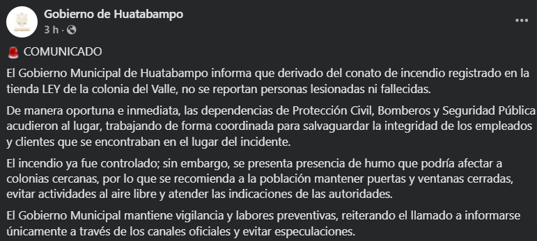 El Gobierno Municipal señaló que se mantiene la vigilancia y las labores preventivas en la zona, además de exhortar a la ciudadanía a informarse únicamente a través de canales oficiales y evitar especulaciones.