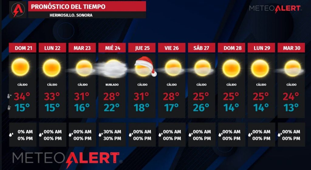 Para el jueves 25 de diciembre, se anticipa el retiro de la mayor parte de la nubosidad, lo que permitiría que la temperatura máxima supere nuevamente los 30°C, mientras que el amanecer se mantendría alrededor de los 18 grados, configurando una Navidad inusualmente cálida para Hermosillo.