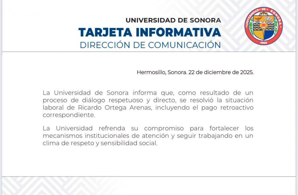 En un comunicado, la Unison detalló que “como resultado de un proceso de diálogo respetuoso y directo”, se resolvió el conflicto que tenían con el académico, entre ellos el pago retroactivo correspondiente.