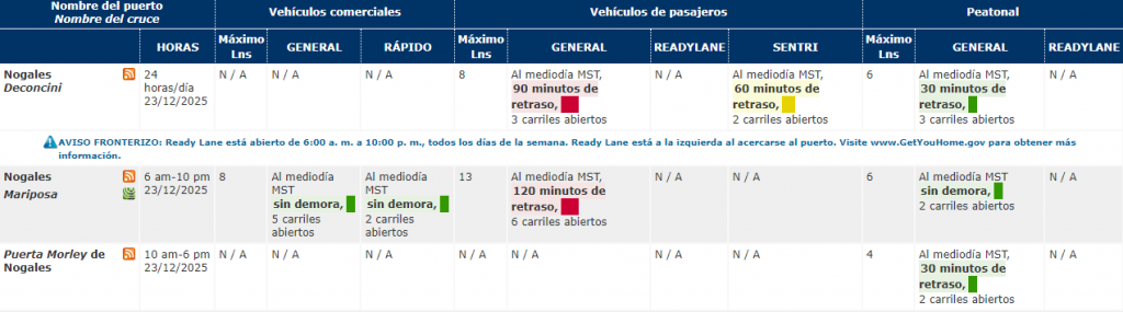 Nogales, Sonora.- Tiempos de espera de hasta dos horas se registran en las garitas de la frontera entre Nogales, Sonora y Arizona este martes 23 de diciembre, de acuerdo con el informe de Aduanas y Protección Fronteriza de Estados Unidos.