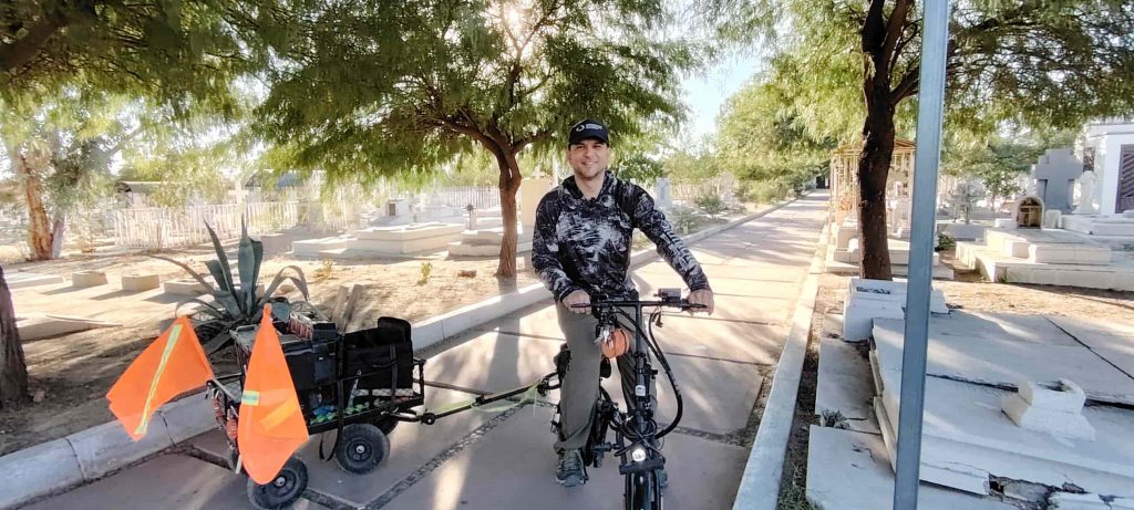 En entrevista para Proyecto Puente, se observó a Sergio Muller, responsable de la Dirección de Proyectos de Caminantes del Desierto, arribar al Bosque Memorial de Hermosillo a bordo de una bicicleta eléctrica.