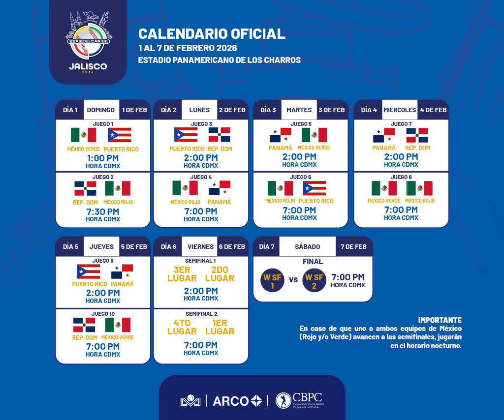 La actividad arrancará el domingo 1 de febrero con doble cartelera. A la 1:00 de la tarde (hora de CDMX), México Verde se medirá ante Puerto Rico, mientras que a las 7:30 de la noche, República Dominicana enfrentará a México Rojo, marcando el inicio formal del torneo.