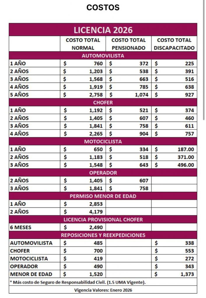 Las autoridades estatales informaron que a estos costos se deberá sumar el pago del seguro de responsabilidad civil, equivalente a uno punto cinco UMA vigente. Los valores estarán vigentes durante todo el año 2026.