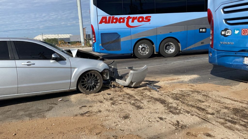 Hermosillo, Sonora.- Un accidente de tránsito se registró durante la mañana del domingo al sur de Hermosillo, luego de que el conductor de uno de los vehículos se quedó dormido al volante, lo que derivó en un choque entre un automóvil tipo sedán y un camión de pasajeros de servicio privado, con saldo de tres personas lesionadas.