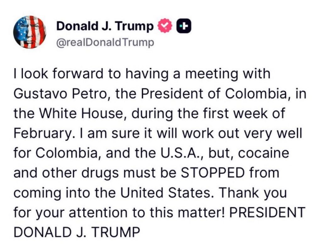 “Estoy seguro de que [la visita] saldrá muy bien para Colombia y para Estados Unidos, pero la cocaína y otras drogas deben SER IMPEDIDAS de ingresar a Estados Unidos”, escribió Trump en su plataforma Truth Social.