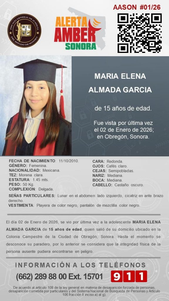 Ciudad Obregón, Sonora.— La Fiscalía General de Justicia del Estado de Sonora activó la Alerta Amber para la búsqueda y localización de la adolescente María Elena Almada García, de 15 años de edad, quien fue vista por última vez el 2 de enero de 2026 en Ciudad Obregón.