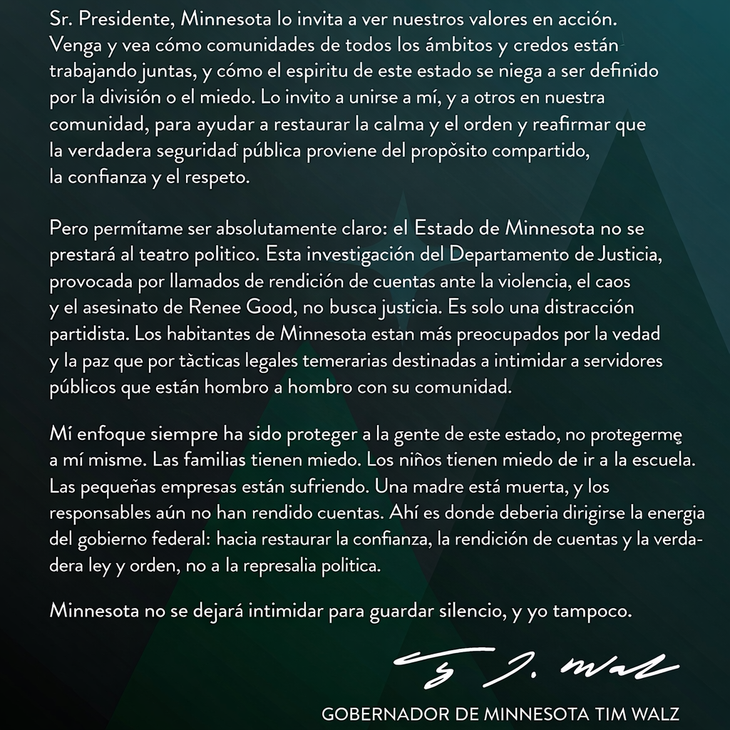 MINNEAPOLIS – El gobernador de Minnesota, Tim Walz, respondió en redes sociales al presidente Donald Trump después de que se informara que el Departamento de Justicia presentó seis requerimientos judiciales contra autoridades locales por presunta obstrucción de la aplicación de la ley de inmigración.