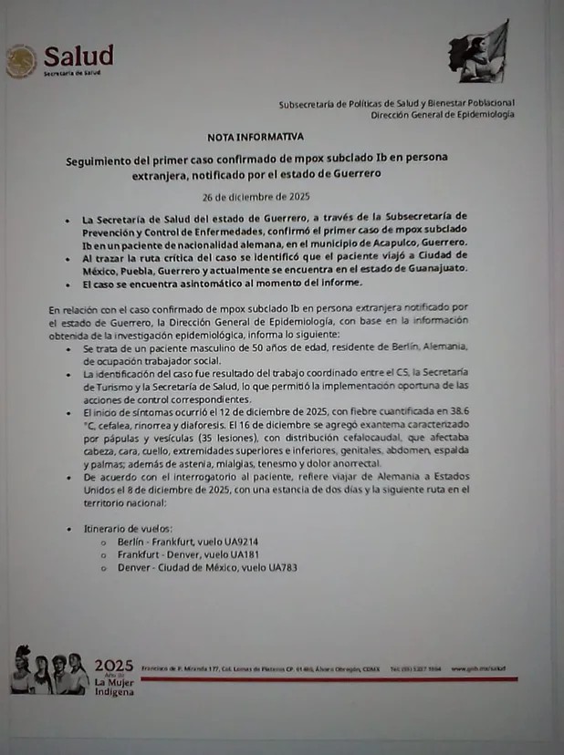 Las autoridades sanitarias confirmaron la detección del primer caso de viruela símica (mpox subclado Ib) en México, correspondiente a un hombre de 50 años, originario de Alemania, quien durante el periodo de incubación y desarrollo de la enfermedad se desplazó por Ciudad de México, Puebla y Guerrero.
