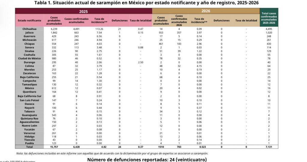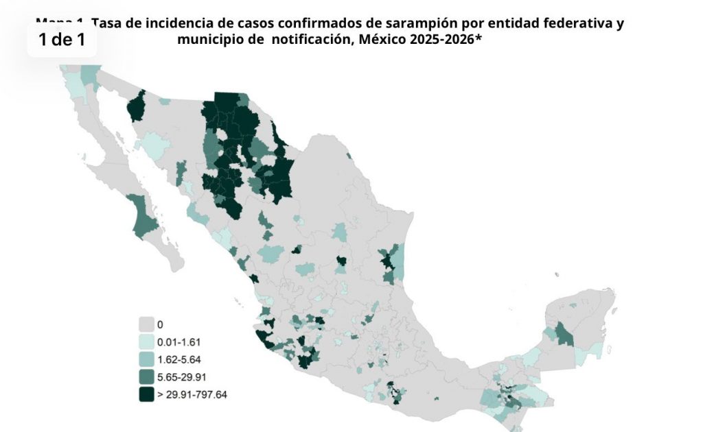 Sonora registra 114 casos confirmados de sarampión durante el periodo 2025–2026, con una tasa de incidencia de 3.4 casos por cada 100 mil habitantes, de acuerdo al Informe diario del brote de sarampión en México, con corte al 18 de enero de 2026.