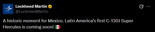 A través de un post en su cuenta de X (antes Twitter), la compañía de industria militar Lockheed Martin, dio a conocer la adquisición por parte de las Fuerza Aérea Mexicana (FAM) de su primer avión de transporte táctico C-130J-30 ‘Super Hercules’.