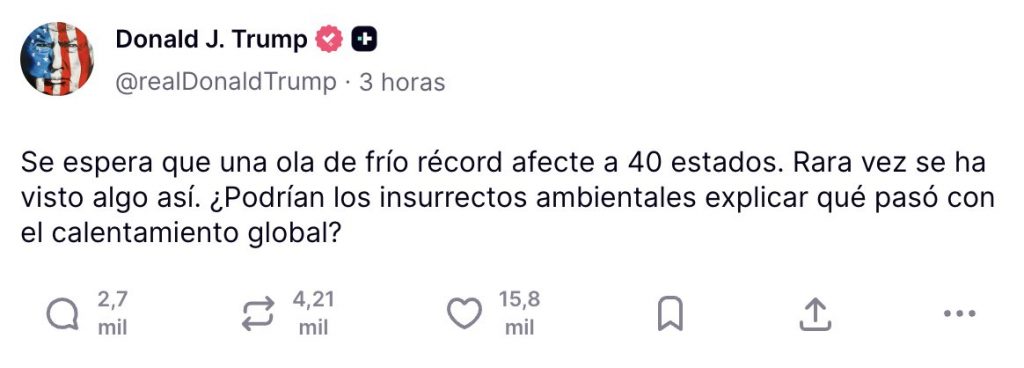 “Se espera que una ola de frío récord afecte a 40 estados. Rara vez se ha visto algo parecido. ¿Podrían los ‘insurrectos ambientales’ explicar QUÉ PASÓ CON EL CALENTAMIENTO GLOBAL?”, escribió.