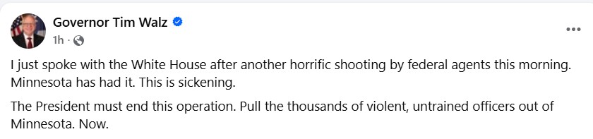 El gobernador Tim Walz acusó directamente a la Casa Blanca de escalar la violencia en Minnesota y exigió el retiro inmediato del ICE del estado. “Esto no puede seguir ocurriendo”, señaló, al calificar las redadas como una operación “descontrolada”.