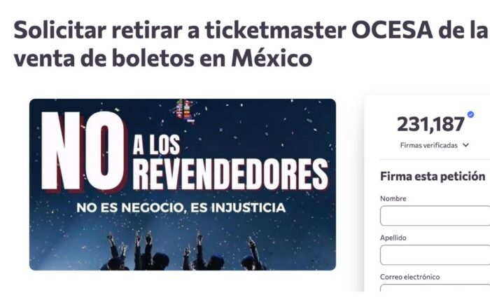 “Exigimos que Ticketmaster OCESA sea retirado de la venta de boletos en México y que se implementen regulaciones más estrictas sobre la transparencia y ética en la venta de entradas”, sentencia la petición.