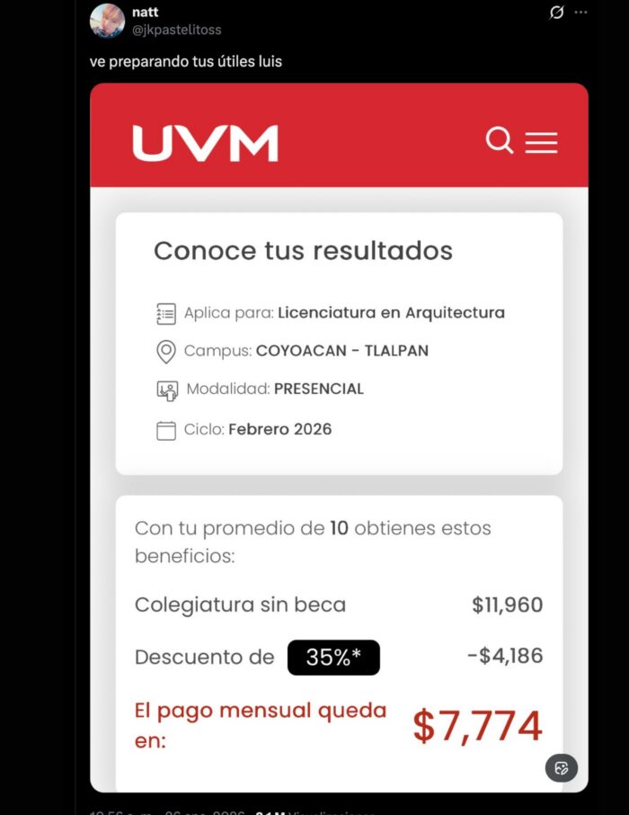 En redes sociales compartieron capturas de pantalla de estos registros. En un caso particular difundido en la red social X, se exhibió la solicitud de inscripción de un individuo en la licenciatura de Arquitectura de la UVM, campus Coyoacán, generándole una ficha de pago mensual de 7,774 pesos bajo un esquema de beca.