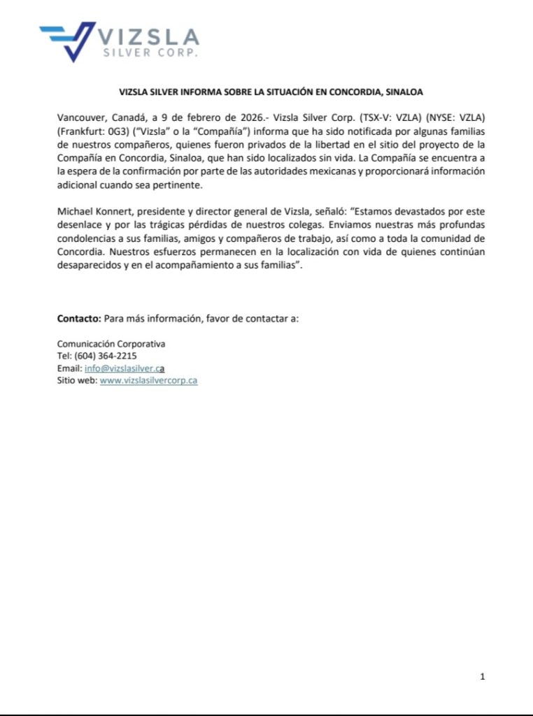 Tras la desaparición de trabajadores en Concordia, Sinaloa, la minera canadiense Vizsla Silver confirmó que fue notificada sobre la localización sin vida de algunos de ellos, mientras espera la confirmación oficial de las autoridades mexicanas.